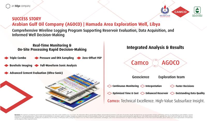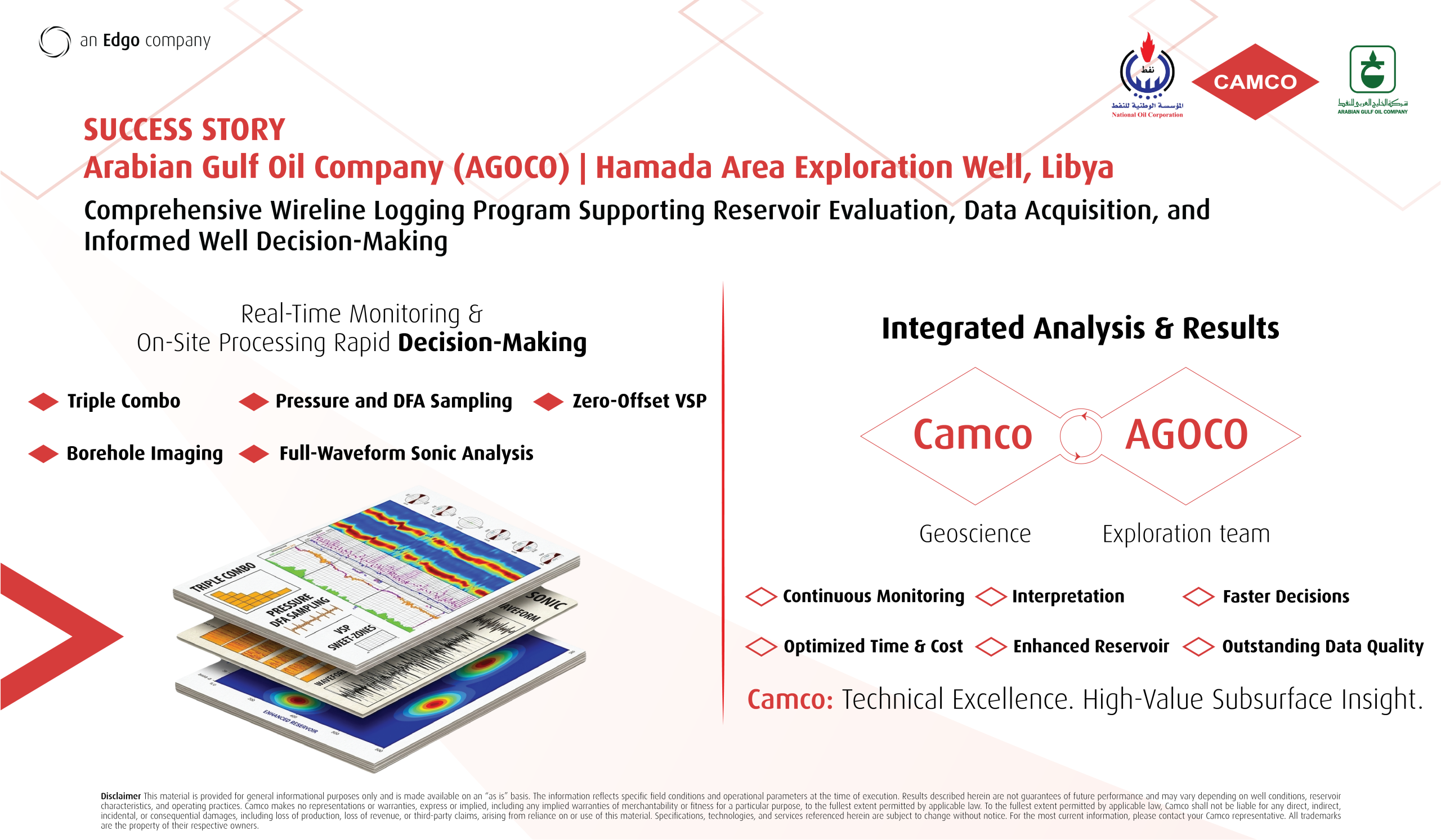 Execution was supported by continuous real-time monitoring, on-site data processing, and rapid interpretation, allowing immediate validation of data quality and efficient operational adjustments. Camco’s Geoscience team worked in close coordination with AGOCO’s exploration team, integrating petrophysical analysis, reservoir insights, and logging data to enhance subsurface understanding and support timely decision-making.